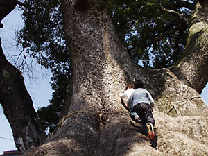 樹齢は1500年を超えるとされ、全国8位の巨木とある。 子供達が遊んでいたので、特別に出演をいただいた(後ろ姿だけど・笑) 小学校低学年生とおぼしき彼らだが、木の幹で遊ぶその姿から巨木ぶりがお分かり頂けるだろう。相対的に、普通の木の枝に提げる“てるてる坊主”位の大きさに見えてしまう。