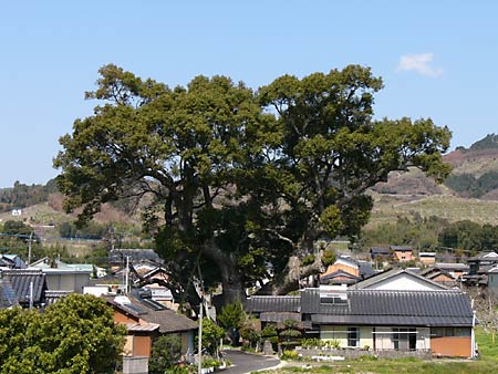 隠家森【かくれがのもり】とあるから、てっきりそういった鬱蒼とした森があると思う自分がいる…しかし… 朝倉町の国道386号線を日田方面に走っていると、隠家森は右と表示される。「そちらは川じゃん、山は左だよ、おかしくない?」と半信半疑でハンドルを回す。国道を曲がるとすぐに筑後川にかかる恵蘇宿橋となるが、標識に従うとその森は国道と川のわずか200m弱のところにあった。 隠家森、それは大きな樟【クス:楠】の木であった。