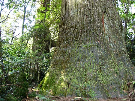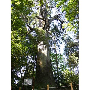 この写真が、なかでも最も大きいとして巨木百選に選ばれた行者杉の父:通称「大王杉」である。判りづらいかもしれないがもの凄い迫力である。幹周り8m29cm、樹高52m、林野庁の推定樹齢としては600年とされる。 |