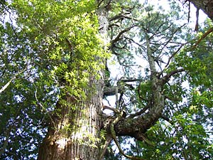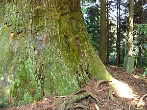 「・・・そびえ立つ」という表現はまさにこのようなものであろう。分かれた枝ぶりは杉とは思えまいが、その大きさ自体周囲の普通の杉の幹よりも大きい。