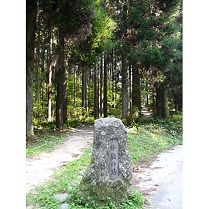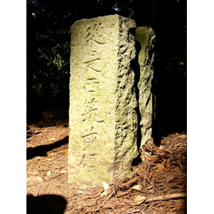 行者杉の傍らに、長年続いた筑前と豊前の国境争いが解決した元禄14年(1701年)に両藩によって設置された石碑。背中合わせに立てられた石碑にはそれぞれ「従是西筑前領」「従是東豊前領」と刻まれている。