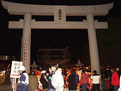 毎年1月7日に久留米市大善寺玉垂宮で行われる鬼夜(おによ)は、日本三大火祭りの一つとされ1600年を超える歴史をもつ火祭りです。 新年の邪気を払う追儺(ついな:鬼やらい。昔、宮中で大みそかの夜、悪魔を追い払った儀式。節分の豆まきはこれの転じたもの「旺文社国語辞典より」)の祭りで、国指定の重要無形民族文化財となっています。 写真は鬼夜が行われる大善寺玉垂宮の正面鳥居です。
