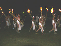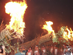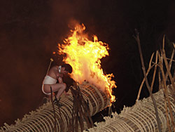 いよいよ点火の瞬間。大松明は思いのほか一気に炎を上げました。それまで大松明に近づいていた観客衆は慌てて下がります。最前列に腰を下ろしていた私もこの瞬間必死でしたね。