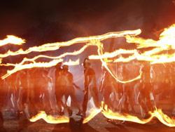 神事が終了すると、大松明が神殿を時計周りに移動を開始します。なにしろ重さが1.2tあるそうですから、移動は容易ではありません。燃えて少しずつ小さくなっているものの、移動開始時はまだまだ大きな姿です。かしの木の棒で支えながらゆっくりと進みます。 移動時には火の粉が若衆に降り注ぐ場面もしばしば見られ、大丈夫か心配になるほど。 大松明の移動は神殿を数回周りこの大松明が燃え尽くされるまで続くとのことで、終るのは24時近くになるようです。