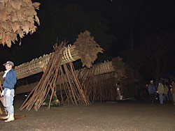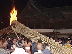大松明が時間とともに燃えて短くなりますが、それとともに縄を解く作業に若衆が大松明に登ります。また大松明が短くなるにつれ、支柱位置も移動させねばならず、かしの木の棒(かり又と呼ぶそう)で多くの若衆が大松明を支え、その間に支柱を動かす勇壮な姿が見られます。