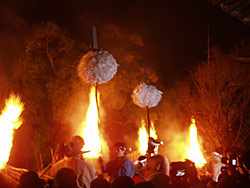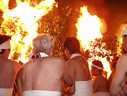 大松明の炎の前では、赤鬼と青鬼登場する古式の魔払い神事がとり行われます。その間の照明はこの大松明の光のみ、この神聖な光の中で神事は進められます。