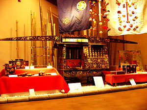 初代立花藩主立花宗茂着用の甲冑をはじめ、立花家に伝わる歴史ある品々が納められ公開されています。 写真は、江戸時代身分の高い人しか乗ることの出来なかった乗り物です。 時代劇ではよくお姫様が乗ってますが、意外と実物は小さい乗り物です。一度乗ってみたいのですが、展示品のため触ることも出来ませんでした。(編集注:担ぐ人もいないのでは・・・?)