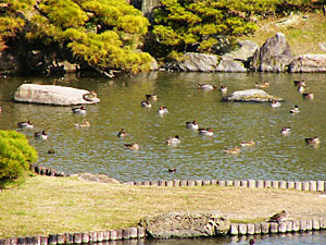 毎年、冬期には500羽に及ぶ野鴨が訪れる松涛園。 この日は暖かく、鴨たちものびのびと遊んでいました。 庭園内に降りることもできるのですが、鴨たちを刺激しないように遠くから撮影しました。